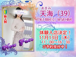 💖『天海さん』 13日(木)11:00~16:30 最終受付にてドキドキ体験入店決定💖